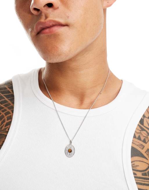 Lost Souls - Collana in acciaio inossidabile con ciondolo ovale inciso a moneta e pietra occhi di tigre