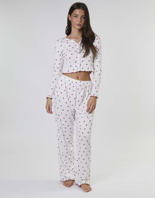 Loungeable - Completo con maniche lunghe e pantaloni in jersey a coste bianco con stampa di ciliegie