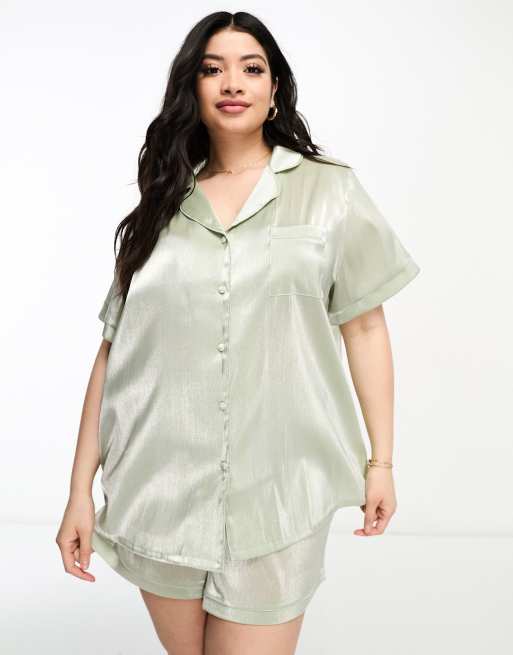 Loungeable Curve - Completo da damigella con pantaloncini e camicia a maniche corte in taffetà verde salvia