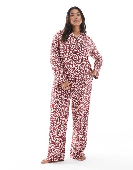 Loungeable Curve - Pigiama in jersey super morbido rosso leopardato con rever e bordini a contrasto