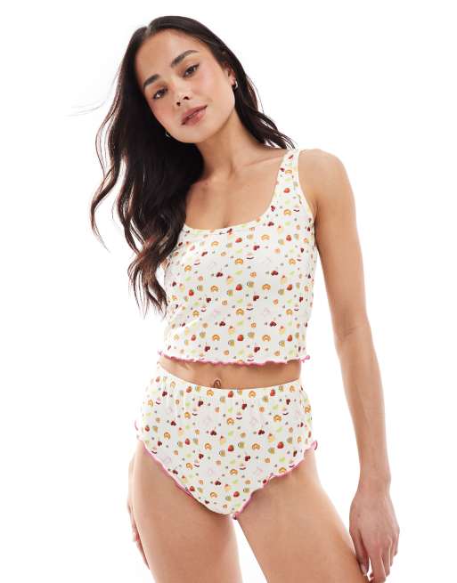 Loungeable - Set pigiama con canotta corta e slip in piqué con stampa di frutta