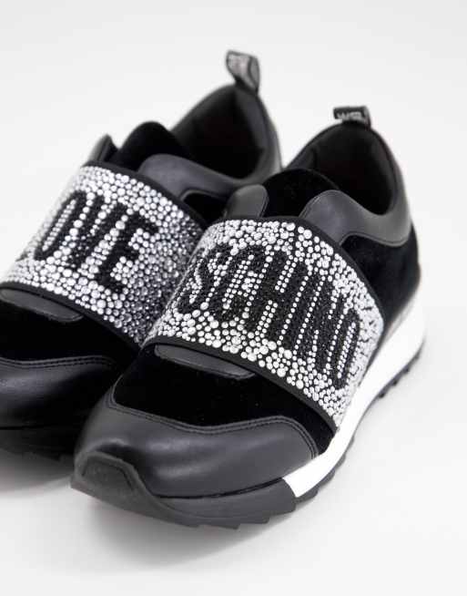 Love Moschino - Sneakers stringate nere con fascia e logo con strass