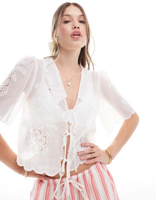 Mango - Blusa bianca ricamata allacciata sul davanti