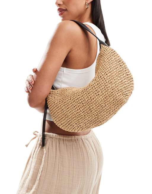 Mango - Borsa da spalla all'uncinetto marrone chiaro con manico in pelle