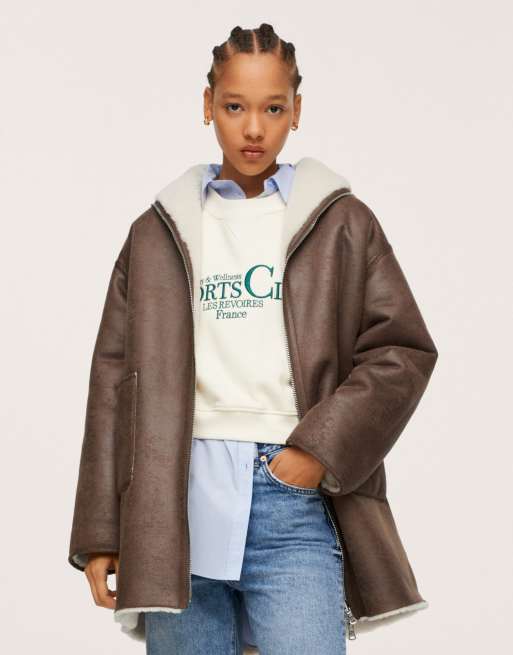 Mango - Cappotto comodo double-face in pelle marrone con montone