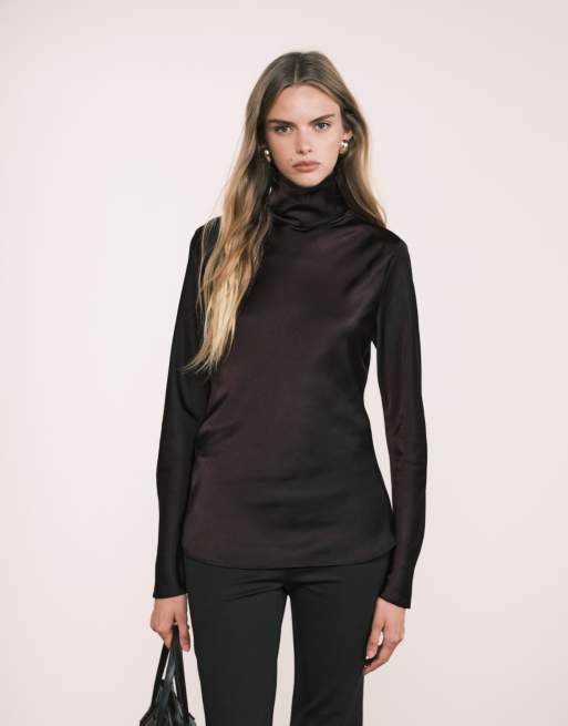 Mango - Capsule - Top accollato a maniche lunghe in tessuto effetto raso color prugna