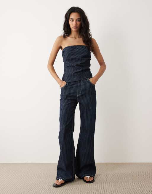 Mango - Isola - Coordinato blu scuro a righe con top in denim con spalle scoperte e jeans