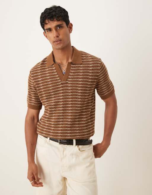 Mango - Polo in maglia leggera marrone a righe con rever
