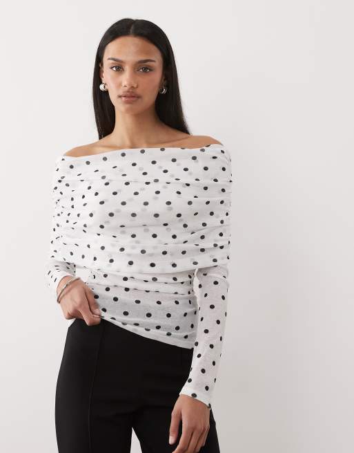 Mango - Top a maniche lunghe bianco e nero a pois con spalle scoperte