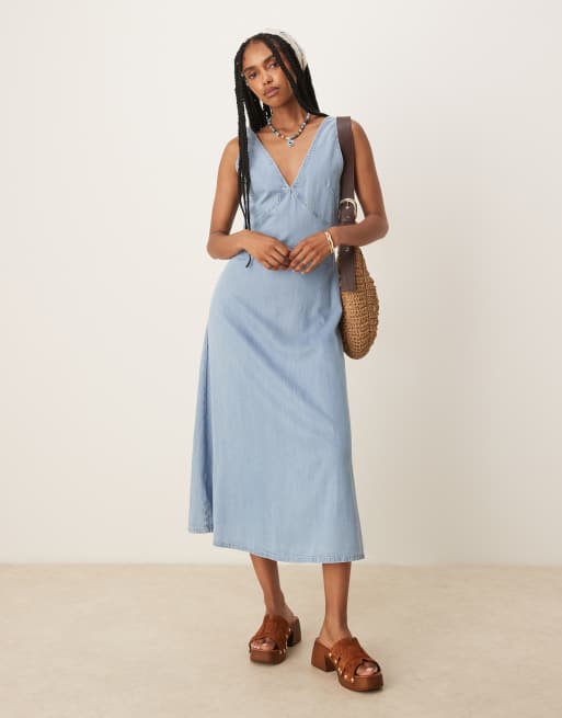 Mango - Vestito a trapezio in denim morbido blu con scollo a V e gonna al polpaccio