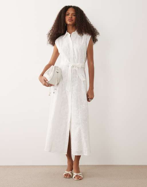 Mango - Vestito camicia midi allacciato in vita in 100% cotone bianco ricamato