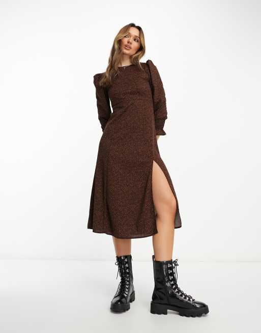 Mango - Vestito midi svasato a maniche lunghe con spacco laterale bordeaux a pois