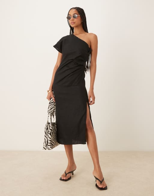 Mango - Vestito nero in lino monospalla arricciato in vita