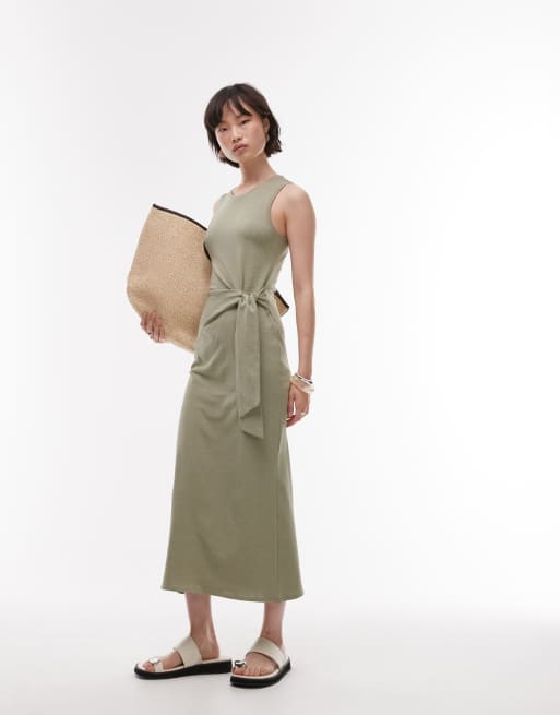 Mango - Vestito verde salvia con gonna al polpaccio e allacciato in vita