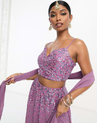 Maya - Coordinato lilla con paillettes in 3D con gonna lunga, sciarpa e crop top