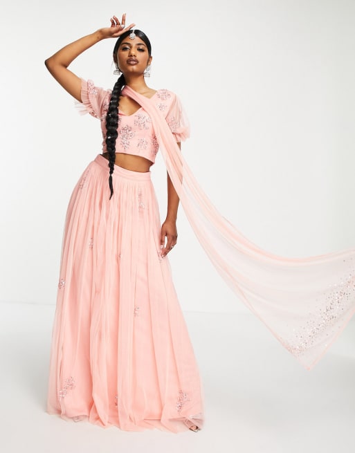Maya - Lehenga con sciarpa color cipria decorata con fiorellini