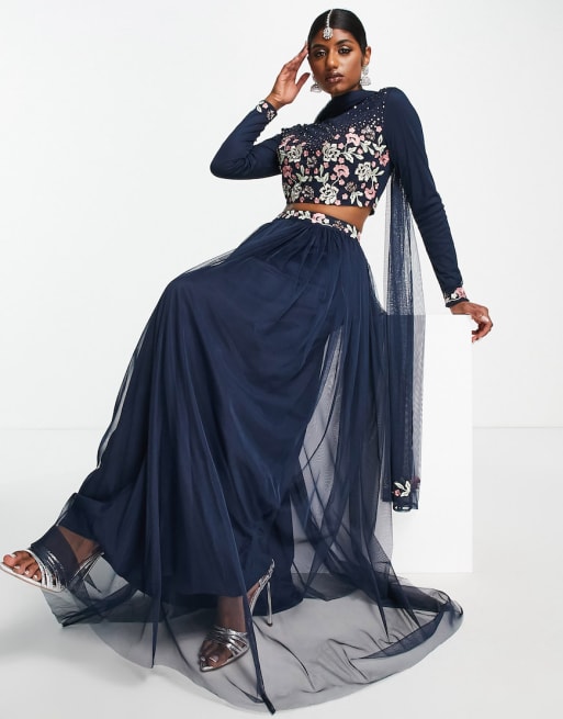 Maya - Lehenga - Crop top, sciarpa e gonna lunga elegante blu navy con decorazioni