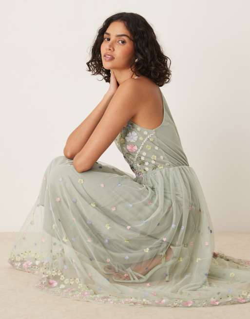 Maya - Vestito al polpaccio allacciato al collo verde salvia ricamato a fiori