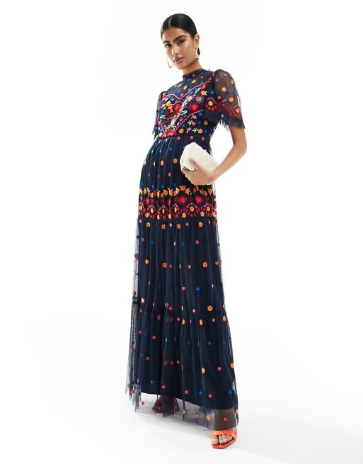 Maya - Vestito lungo decorato blu navy a fiori vivaci