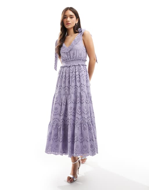 Maya - Vestito midi in pizzo lavanda polvere con spalline sottili e scollo a V