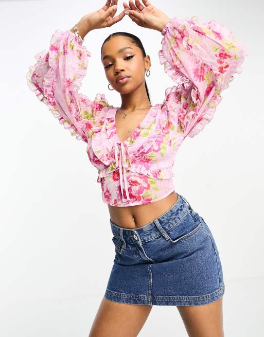 Miss Selfridge - Blusa allacciata sul davanti rosa in chiffon con stampa rétro a fiori e volant