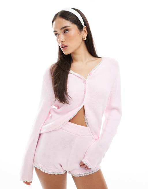 Miss Selfridge - Cardigan in maglia rosa con finiture in pizzo in coordinato