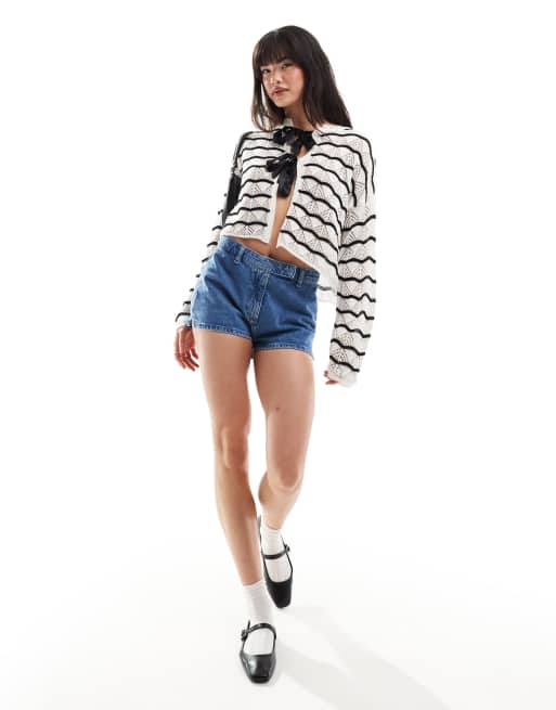 Miss Selfridge - Cardigan in maglia traforata a righe monocromatiche con fiocco