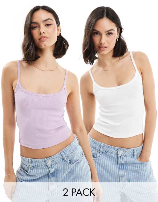 Miss Selfridge - Confezione da 2 canottiere bianca e lilla a coste con finiture in pizzo