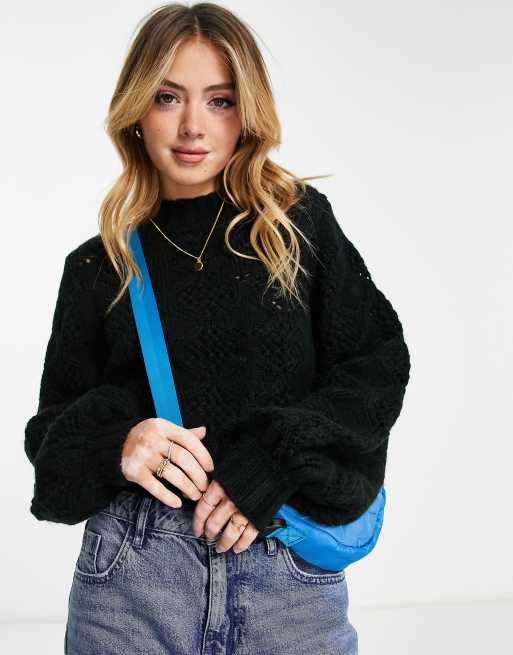 Miss Selfridge - Maglione in maglia morbidissima nera traforata con maniche a palloncino