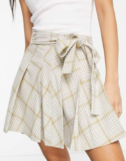 Miss Selfridge - Minigonna stile kilt a pieghe color pietra a quadri allacciata sul davanti