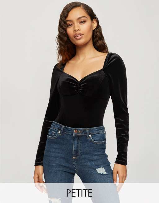 Miss Selfridge Petite - Body nero in velluto con scollo a cuore