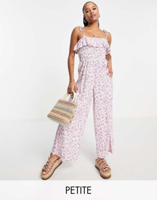 Miss Selfridge Petite - Tuta jumpsuit arricciata con spalline sottili lilla a fiorellini - LILAC