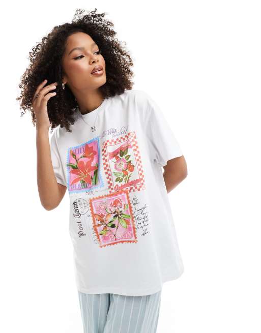 Miss Selfridge - T-shirt bianca oversize con stampa di cartoline