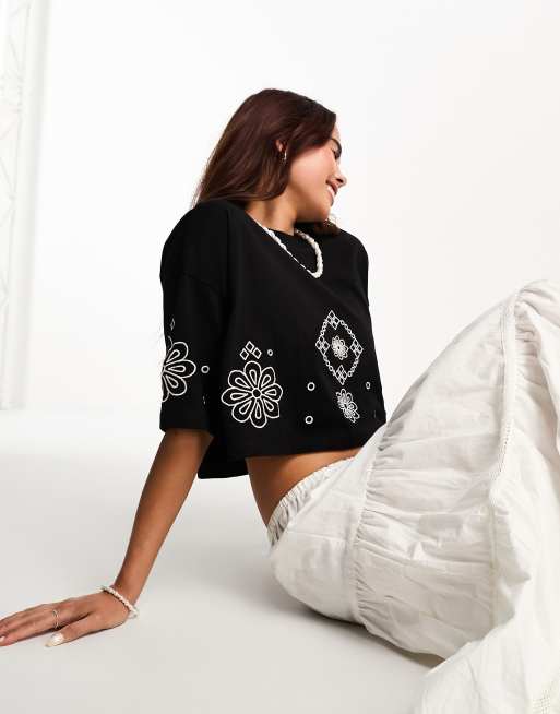Miss Selfridge - T-shirt corta nera in pizzo sangallo