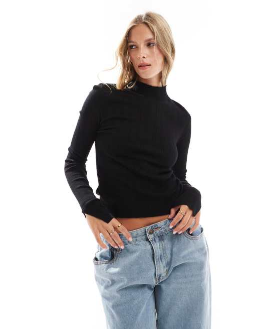 Miss Selfridge - Top a maniche lunghe con collo a imbuto nero in maglia trasparente