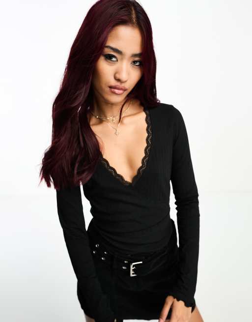 Miss Selfridge - Top a portafoglio nero a coste con finiture in pizzo