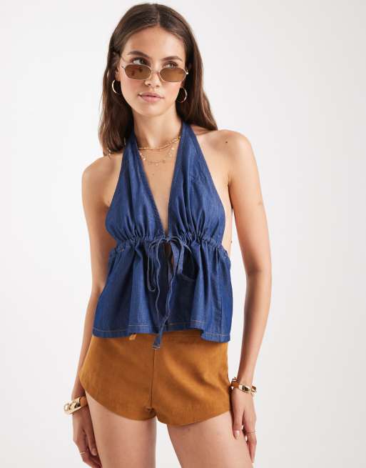 Miss Selfridge - Top allacciato al collo in denim chambray lavaggio blu