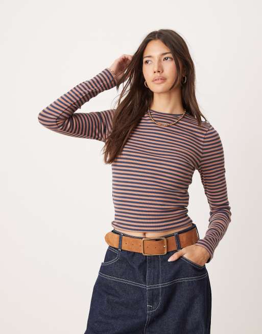 Miss Selfridge - Top girocollo a maniche lunghe blu navy e marrone a righe a coste