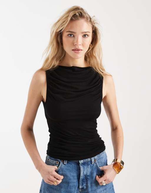 Miss Selfridge - Top nero arricciato con scollo a barchetta