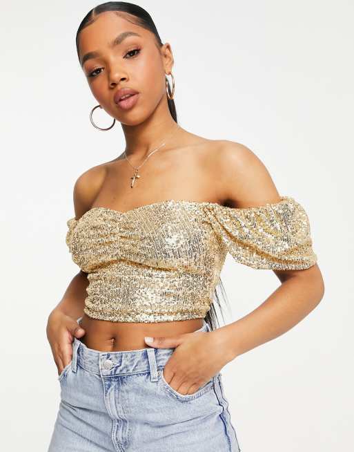 Miss Selfridge - Top oro con paillettes e maniche a sbuffo