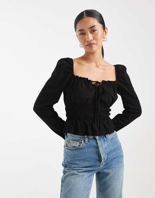 Miss Selfridge - Top stile milkmaid nero con maniche a palloncino a maniche lunghe