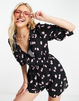 Miss Selfridge - Tuta corta a portafoglio viola a fiori con volant