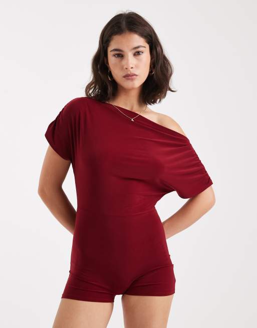 Miss Selfridge - Tuta corta bordeaux con spalla scoperta