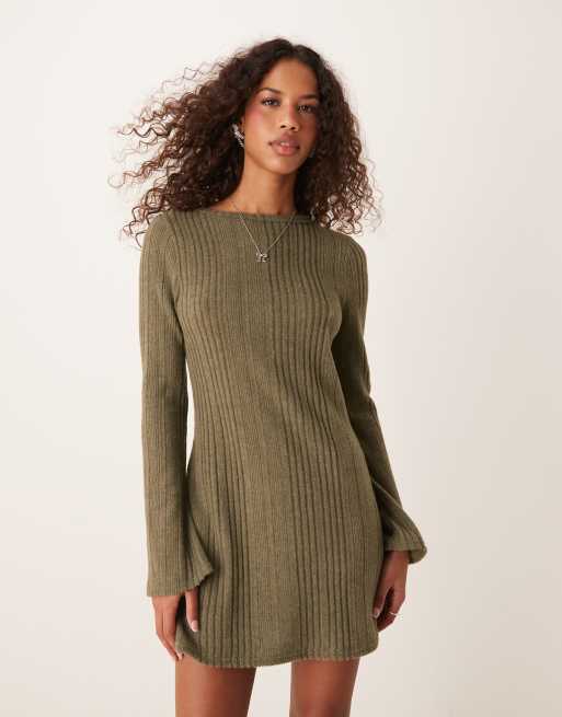 Miss Selfridge - Vestito con corpino aderente e gonna svasata morbido spazzolato a coste kaki