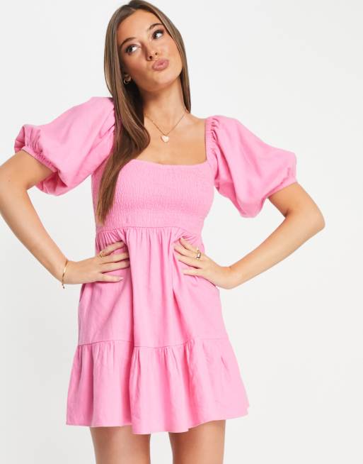 Miss Selfridge - Vestito corto in lino arricciato rosa con corpino aderente e gonna svasata