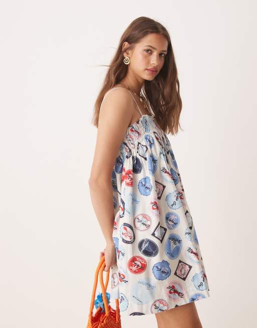 Miss Selfridge - Vestito grembiule corto estivo con stampa ispirata alle vacanze