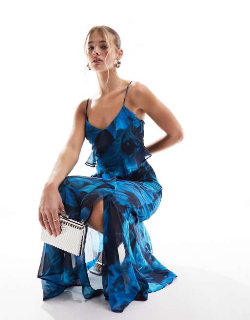 Miss Selfridge - Vestito lungo a balze asimmetrico in chiffon a fiori sfumati