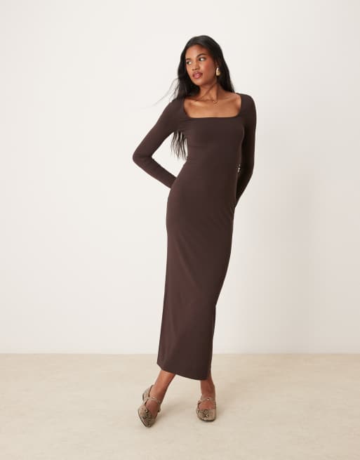 Miss Selfridge - Vestito lungo a maniche lunghe color cioccolato con scollo rotondo