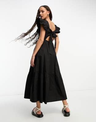 Miss Selfridge - Vestito lungo nero a balze in popeline con spalline con volant