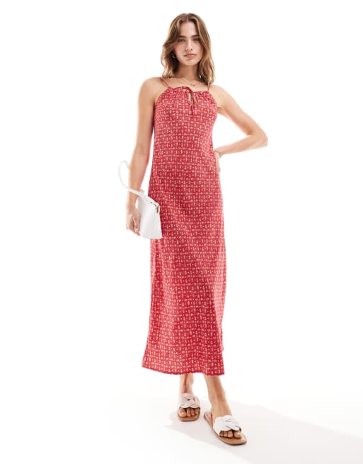 Miss Selfridge - Vestito sottoveste lungo asimmetrico rosso a pois cachemire con laccio sul davanti